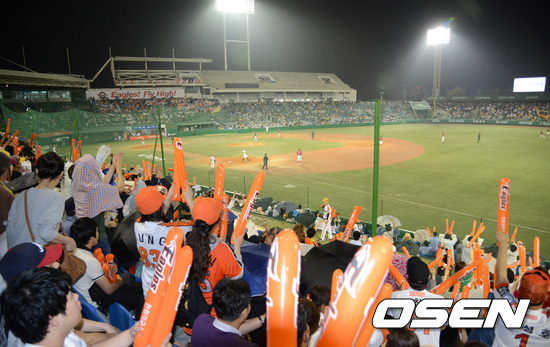 8일 오후 대전 한밭야구장에서 열린 '2012 팔도 프로야구' 한화 이글스와 KIA 타이거즈의 경기, 6회말 대전야구장을 가득 메운 한화 팬들이 열띤 응원을 펼치고 있다.