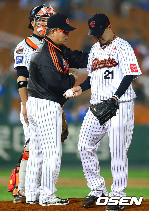 8일 오후 부산 사직구장에서 열리는 2012 팔도 프로야구 롯데 자이언츠와 삼성 라이온즈의 경기 8회초 1사 롯데 양승호 감독이 송승준 선발투수를 교체하고 있다. 송승준은 이날 7⅓이닝 1실점 호투했다.