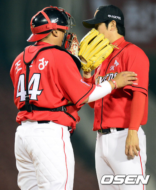 8일 오후 서울 잠실구장에서 열린 '2012 팔도 프로야구' 두산 베어스와 SK 와이번스의 경기 8회말 무사 1루 조인성과 박희수가 이야기를 하고 있다.