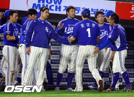 8일 오후 부산 사직구장에서 열리는 2012 팔도 프로야구 롯데 자이언츠와 삼성 라이온즈의 경기 8회말 실점 위기를 막은 삼성 윤성환 투수가 동료들의 축하를 받으며 더그아웃으로 들어가고 있다