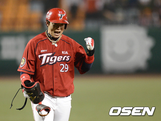 8일 오후 대전 한밭야구장에서 열린 '2012 팔도 프로야구' 한화 이글스와 KIA 타이거즈의 경기, 7회초 1사 1루 KIA 나지완이 역전 1타점 적시타를 날리고 환호하고 있다.