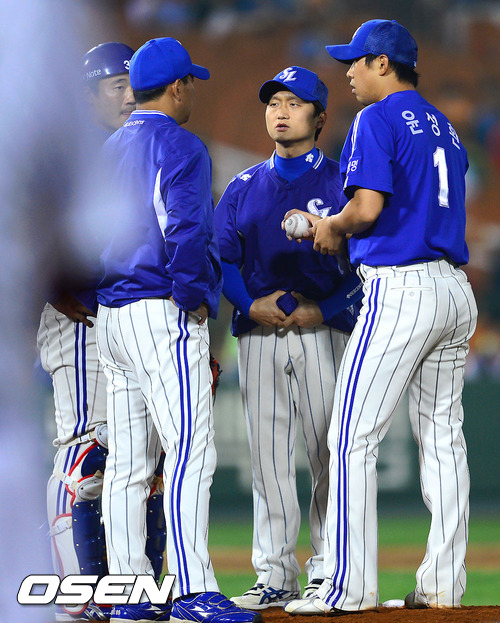 8일 오후 부산 사직구장에서 열리는 2012 팔도 프로야구 롯데 자이언츠와 삼성 라이온즈의 경기 8회말 2사 2루 삼성 오치아이 투수 코치가 마운드에 올라와 윤성환 선발투수와 이야기를 나누고 있다.