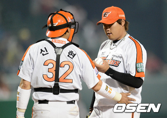 8일 오후 대전 한밭야구장에서 열린 '2012 팔도 프로야구' 한화 이글스와 KIA 타이거즈의 경기, 7회초 무사 2루 KIA 안치홍에게 동점타를 허용한 한화 류현진이 포수 신경현과 이야기를 나누고 있다.