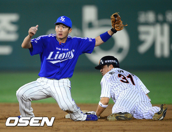 8일 오후 부산 사직구장에서 열리는 2012 팔도 프로야구 롯데 자이언츠와 삼성 라이온즈의 경기 8회말 1사 1루 롯데 이승화의 타석때 1루 주자 손아섭이 2루 도루 성공해 세이프되고 있다.