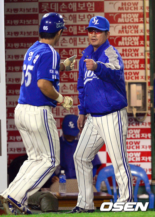 8일 오후 부산 사직구장에서 열리는 2012 팔도 프로야구 롯데 자이언츠와 삼성 라이온즈의 경기 9회초 무사 1,3루 삼성 손주인이 1타점 적시타를 날렸다. 류중일 감독이 3루 주자 배영섭과 하이파이브를 하고 있다.