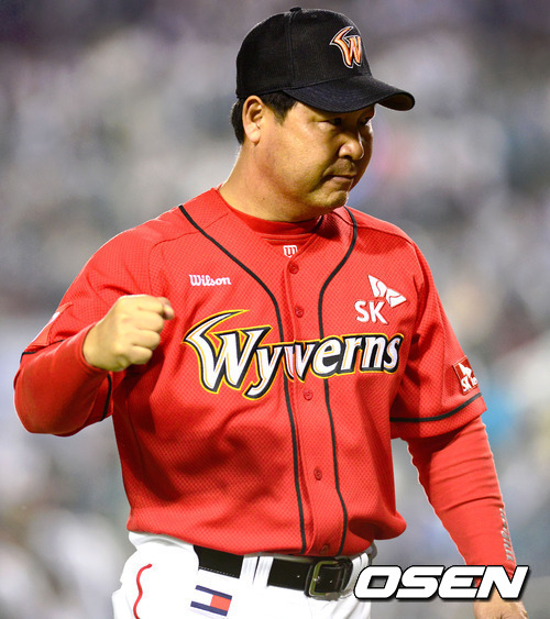 8일 오후 서울 잠실구장에서 열린 '2012 팔도 프로야구' 두산 베어스와 SK 와이번스의 경기 종료후짜릿한 승리를 거둔 SK 이만수 감독이 기뻐하고 있다.