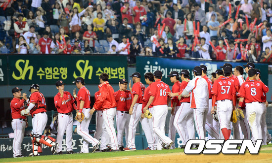 8일 오후 서울 잠실구장에서 열린 '2012 팔도 프로야구' 두산 베어스와 SK 와이번스의 경기 종료후 SK선수들이 하이파이브를 하며 그라운드를 나가고 있다.