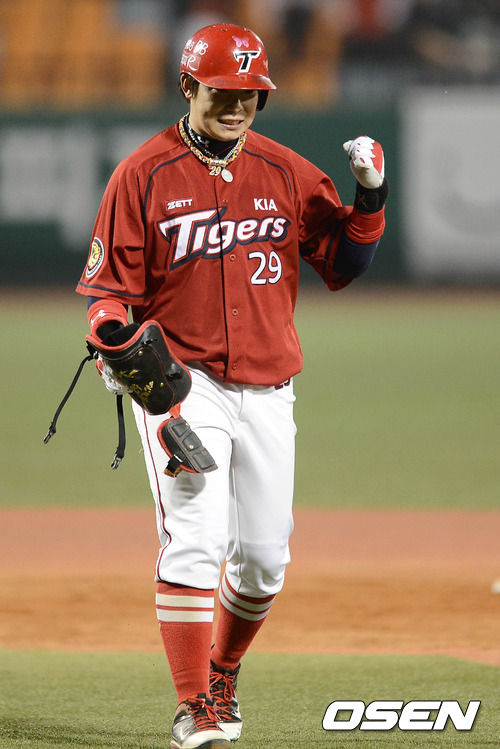 8일 오후 대전 한밭야구장에서 열린 '2012 팔도 프로야구' 한화 이글스와 KIA 타이거즈의 경기, 7회초 1사 1루 KIA 나지완이 역전 1타점 적시타를 날리고 환호하고 있다.