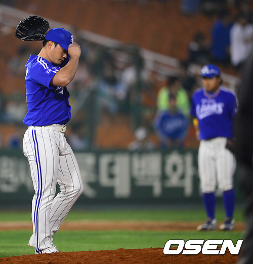 8일 오후 부산 사직구장에서 열리는 2012 팔도 프로야구 롯데 자이언츠와 삼성 라이온즈의 경기 9회말 무사 롯데 선두타자 김주찬에게 2루타를 허용한 삼성 오승환 마무리 투수가 아쉬운 표정을 짓고 있다 .