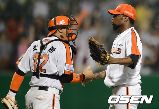경기 종료 후 한화 포수 최승환과 바티스타가 악수를 나누고 있다. / sunday@osen.co.kr