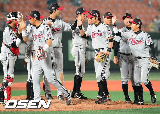 경기를 마치고 LG 선수들이 마운드 근처에 모여서 승리의 기쁨을 나누고 있다. / rumi@osen.co.kr