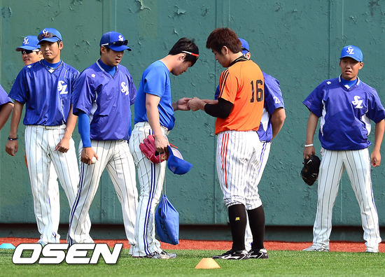 9일 오후 부산 사직구장에서 열리는 2012 팔도 프로야구 롯데 자이언츠와 삼성 라이온즈의 경기 전 롯데 강민호가 손가락 매니큐어를 보이며 삼성 선수들에게 자랑(?)하고 있다.
