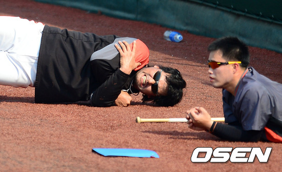 9일 오후 대전구장에서 열린 '2012 팔도 프로야구' 한화 이글스와 KIA 타이거즈의 시즌 4차전, 경기전 한화 박찬호가 외야에서 하나마스 코치의 도움을 받으며 스트레칭을 하고 있다. 반면 마일영은 편히 누워 동료선수들의 훈련을 지켜보고 있다.