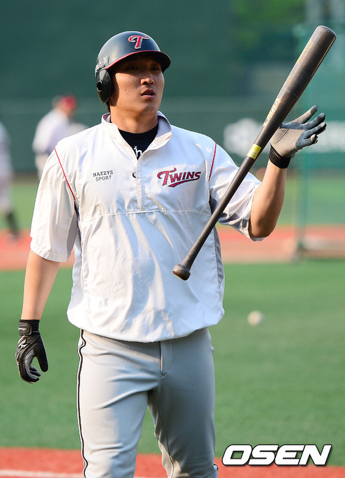 9일 오후 서울 목동구장에서 '2012 팔도 프로야구' 넥센 히어로즈와 LG 트윈스의 경기가 열릴 예정인 가운데 양팀 훈련시간에 LG 이진영이 배트를 돌리며 묘기를 부리고 있다.