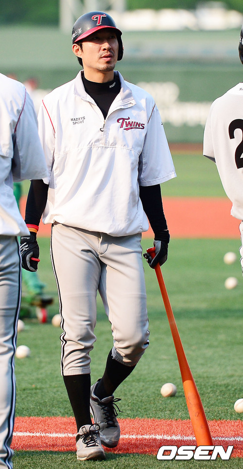 9일 오후 서울 목동구장에서 '2012 팔도 프로야구' 넥센 히어로즈와 LG 트윈스의 경기가 열릴 예정인 가운데 양팀 훈련시간에 LG 정성훈이 타격연습중 생각에 잠겨있다.