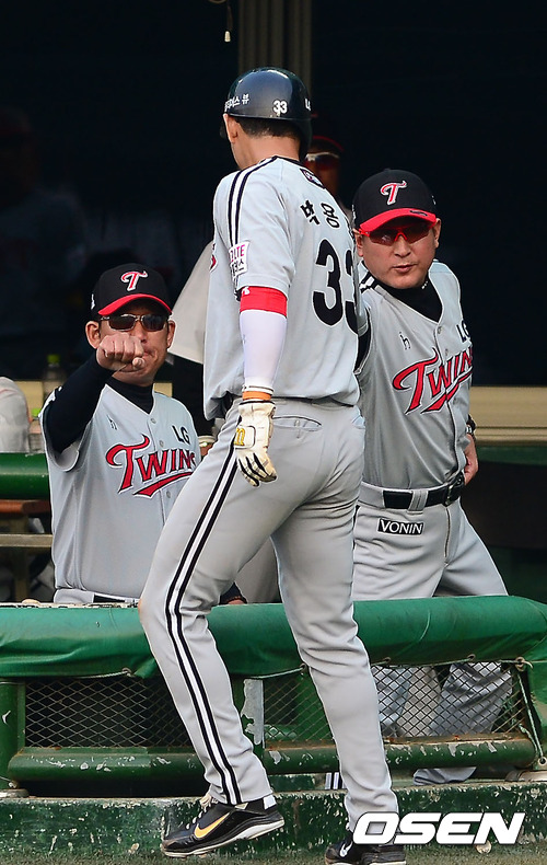 9일 오후 서울 목동구장에서 열린 '2012 팔도 프로야구' 넥센 히어로즈와 LG 트윈스의 경기 1회초 무사 주자 만루 LG 정성훈 타석에서 넥센 선발 밴헤켄의 와일드 피칭때 3루 주자 박용택이 홈을 밟은 후 덕아웃에서 김기태 감독과 하이파이브를 하고 있다.