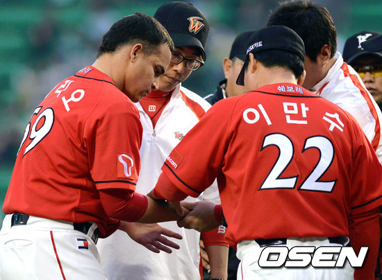 9일 오후 서울 잠실구장에서 열린 '2012 팔도 프로야구' 두산 베어스와 SK 와이번스의 경기 1회말 1사 2루 SK 마리오가 두산 김동주가 타격한 타구를 손가락에 맞아 이만수 감독이 마운드에 올라와 이야기를 나누고 있다.
