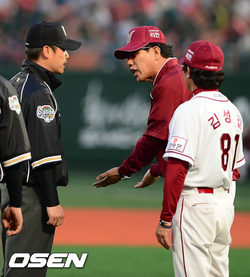 9일 오후 서울 목동구장에서 열린 '2012 팔도 프로야구' 넥센 히어로즈와 LG 트윈스의 경기 3회초 첫타석에서 LG 이진영이 좌중간 2루타를 날린 후 2루에 몸을 던져 세이프가 되자 넥센 김시진 감독이 그라운드로 나와 항의하고 있다.