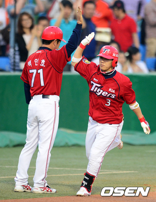 9일 오후 대전구장에서 열린 '2012 팔도 프로야구' 한화 이글스와 KIA 타이거즈의 시즌 4차전, 2회초 2사 1,3루에서 KIA 김선빈이 스리런 홈런을 날리고 백인호 코치와 하이파이브를 하고 있다.