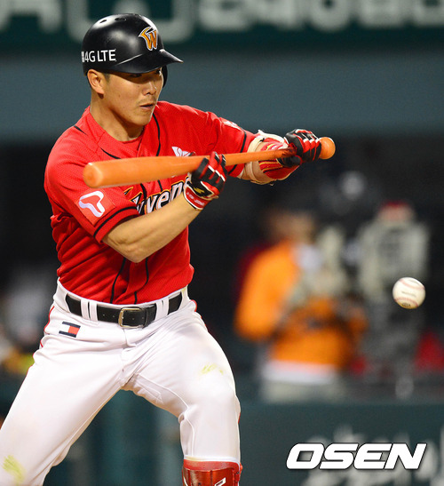9일 오후 서울 잠실구장에서 열린 '2012 팔도 프로야구' 두산 베어스와 SK 와이번스의 경기 4회초 무사 1루 정근우가 희생번트를 치고 있다.