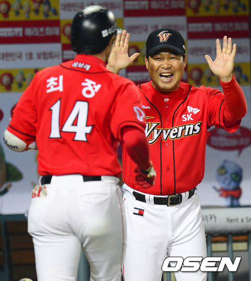 9일 오후 서울 잠실구장에서 열린 '2012 팔도 프로야구' 두산 베어스와 SK 와이번스의 경기 4회초 2사 2루 최정이 투런포를 친후 덕아웃에서 이만수 감독의 축하를 받고 있다.