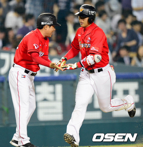 9일 오후 서울 잠실구장에서 열린 '2012 팔도 프로야구' 두산 베어스와 SK 와이번스의 경기 4회초 2사 2루 최정이 투런포를 친후 3루코치 이광근과 하이파이브를 하고 있다.