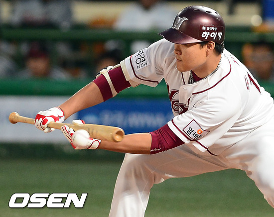 9일 오후 서울 목동구장에서 열린 '2012 팔도 프로야구' 넥센 히어로즈와 LG 트윈스의 경기 3회말 무사 1,2루 넥센 오재일의 보내기 번트를 시도하고 있다.