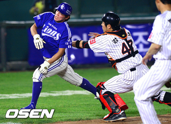 9일 오후 부산 사직구장에서 열린 2012 팔도 프로야구 롯데 자이언츠와 삼성 라이온즈의 경기 5회초 1사 만루 삼성 이승엽의 중견수 앞에 떨어지는 1타점 적시타때 롯데 강민호 포수가 2루 주자 정형식을 태그아웃 시키고 있다.