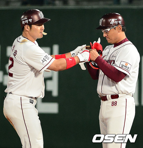 9일 오후 서울 목동구장에서 열린 '2012 팔도 프로야구' 넥센 히어로즈와 LG 트윈스의 경기 4회말 2사 주자 3루 넥센 박병호가 좌익수 오른쪽 1타점 적시타를 날린 후 1루에서 심재학 코치와 하이파이브를 하고 있다.