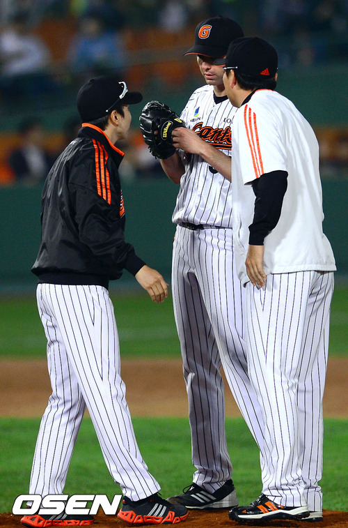 9일 오후 부산 사직구장에서 열린 2012 팔도 프로야구 롯데 자이언츠와 삼성 라이온즈의 경기 5회초 1사 만루 롯데 주형광 투수코치가 마운드에 올라와 사도스키와 이야기를 나누고 있다