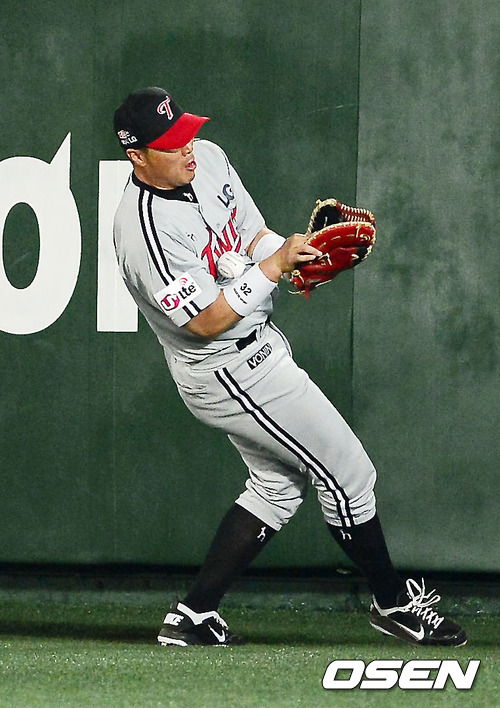 9일 오후 서울 목동구장에서 열린 '2012 팔도 프로야구' 넥센 히어로즈와 LG 트윈스의 경기 5회말 1사 주자 1루 넥센 최경철의 파울타구를 LG 1루수 최동수가 달려가 받으려 했으나 볼이 빠지고 있다.