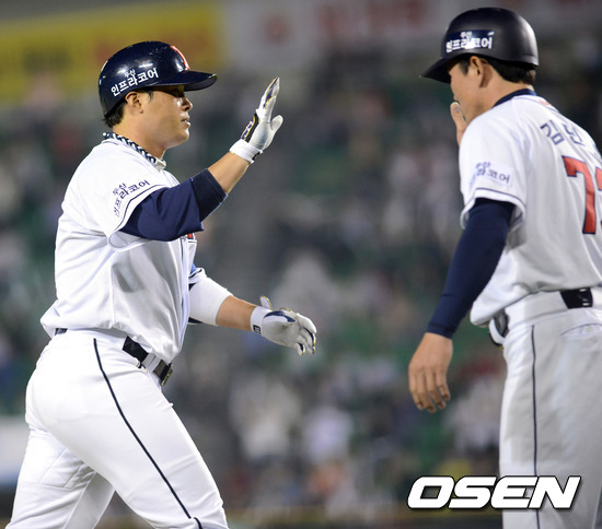 9일 오후 서울 잠실구장에서 열린 '2012 팔도 프로야구' 두산 베어스와 SK 와이번스의 경기 5회말 2사 3루 두산 김동주가 2점 홈런을 치고 김민호 코치와 하이파이브를 하고 있다.