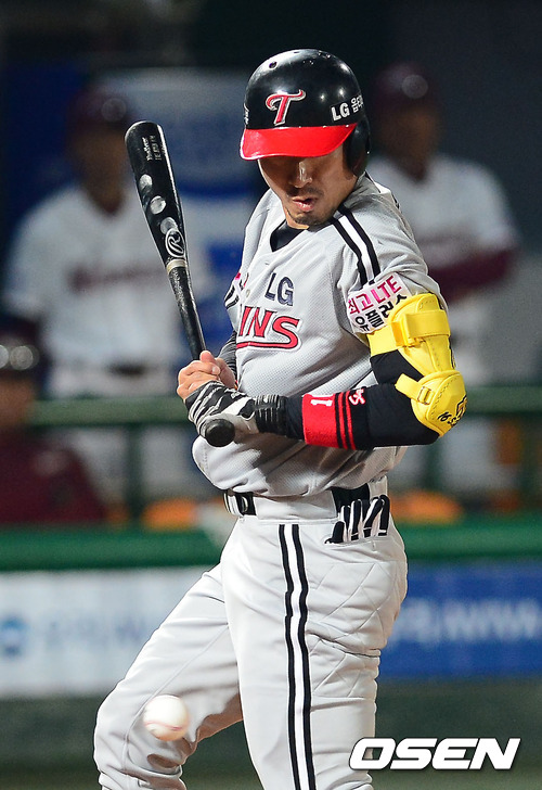 9일 오후 서울 목동구장에서 열린 '2012 팔도 프로야구' 넥센 히어로즈와 LG 트윈스의 경기 7회초 2사 주자 2루 LG 정성훈이 몸에 볼을 맞고 있다.