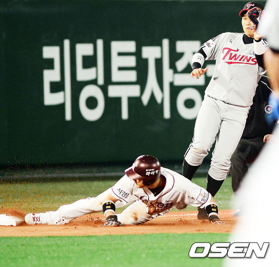 9일 오후 서울 목동구장에서 열린 '2012 팔도 프로야구' 넥센 히어로즈와 LG 트윈스의 경기 6회말 1사 주자 2루 넥센 박병호 타석에서 2루 주자 이택근이 3루 도루에 성공하고 있다.
