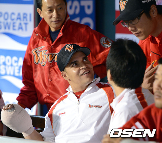 9일 오후 서울 잠실구장에서 열린 '2012 팔도 프로야구' 두산 베어스와 SK 와이번스의 경기 SK 마리오가 덕 아웃에서 박정권과 이야기를 나누고 있다.