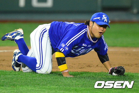 9일 오후 부산 사직구장에서 열린 2012 팔도 프로야구 롯데 자이언츠와 삼성 라이온즈의 경기 8회말 1사 1루 롯데 강민호의 안타때 삼성 박한이의 송구를 박석민 3루수가 잡은 후 그라운드를 엉금엉금 기고 있다.