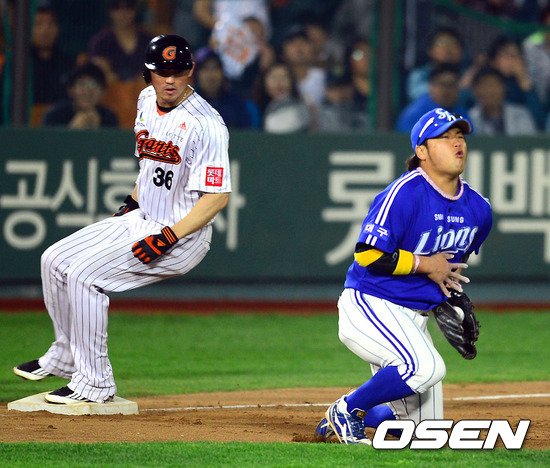 9일 오후 부산 사직구장에서 열린 2012 팔도 프로야구 롯데 자이언츠와 삼성 라이온즈의 경기 8회말 1사 1루 롯데 강민호의 안타때 삼성 박한이의 송구를 박석민 3루수가 공을 잡은 후 그라운드를 엉금엉금 기고 있다.