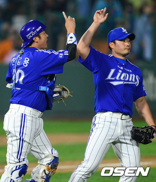 경기종료 후 삼성 진갑용 포수와 오승환 투수가 승리의 세리머니를 펼치고 있다. /soul1014@osen.co.kr