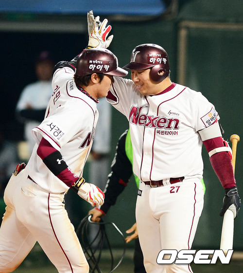 9일 오후 서울 목동구장에서 열린 '2012 팔도 프로야구' 넥센 히어로즈와 LG 트윈스의 경기 8회말 1사 주자 1,2루 넥센 대타 오윤의 스리런포에 이어 김민우가 백투백 솔로포를 날린 후 홈에서 허도환과 하이파이브를 하고 있다.