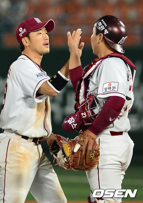 경기를 마치고 넥센 이택근이 허도환과 하이파이브를 하고 있다. / rumi@osen.co.kr