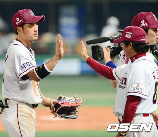 경기를 마치고 넥센 이택근이 김성갑 수석코치와 하이파이브를 하고 있다. / rumi@osen.co.kr