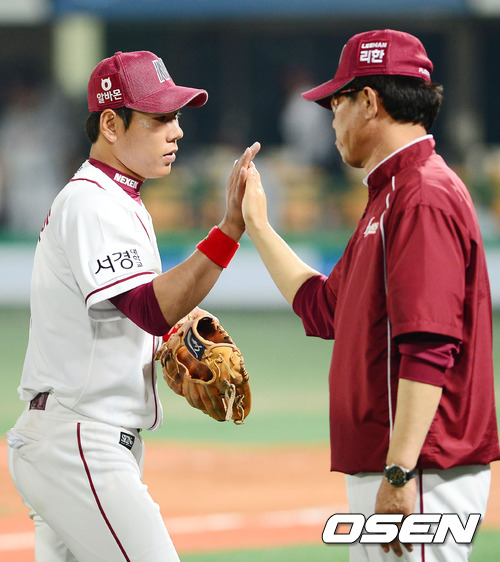 경기를 마치고 넥센 강정호가 김시진 감독과 하이파이브를 하고 있다. / rumi@osen.co.kr