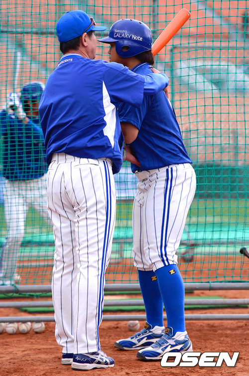 10일 오후 부산 사직구장에서 열린 2012 팔도 프로야구 롯데 자이언츠와 삼성 라이온즈의 경기 삼성 류중일 감독이 박석민의 타격자세를 교정시키고 있다.