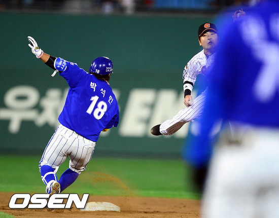 10일 오후 부산 사직구장에서 열린 2012 팔도 프로야구 롯데 자이언츠와 삼성 라이온즈의 경기 4회초 1사 삼성 박석민이 2루타를 날린후 세이프되고 있다.