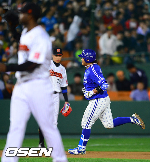 10일 오후 부산 사직구장에서 열린 2012 팔도 프로야구 롯데 자이언츠와 삼성 라이온즈의 경기 6회초 1사 삼성 박석민이 역전 솔로홈런을 날리고 베이스를 돌고 있다
