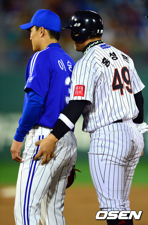 홍성흔이 이승엽의 엉덩이를 만지며 장난치고 있다.