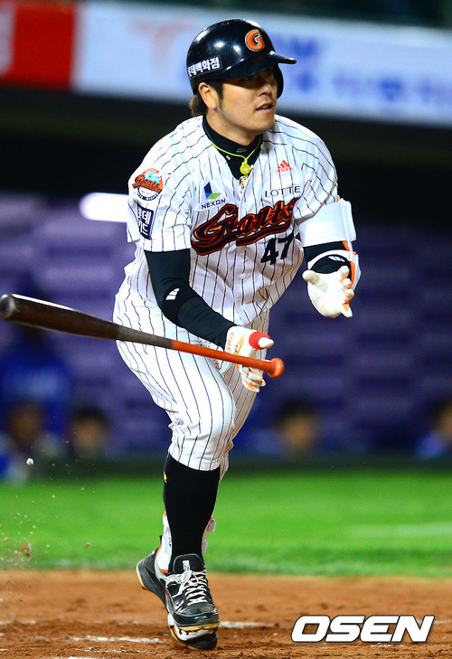 10일 오후 부산 사직구장에서 열린 2012 팔도 프로야구 롯데 자이언츠와 삼성 라이온즈의 경기 7회말 1사 1,3루 롯데 강민호가 동점 적시타를 날리고 있다.