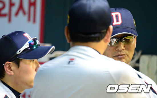10일 오후 서울 잠실구장에서 열린 '2012 팔도 프로야구' 두산 베어스와 SK 와이번스의 경기, 7회초 두산 김진욱 감독과 이토 코치가 더그아웃에서 심각한 표정으로 이야기를 나누고 있다.