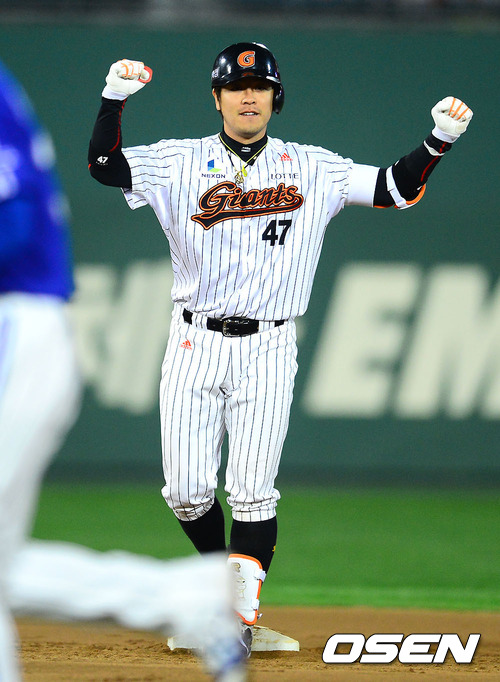 10일 오후 부산 사직구장에서 열린 2012 팔도 프로야구 롯데 자이언츠와 삼성 라이온즈의 경기 7회말 1사 1,3루 롯데 강민호가 동점 적시타를 날리고 포효하고 있다.