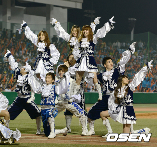 10일 오후 대전 한밭야구장에서 열린 '2012 팔도 프로야구' 한화 이글스와 KIA 타이거즈의 경기, 클리닝타임때 카이스트 치어리더들이 그라운드에서 공연을 하고 있다.